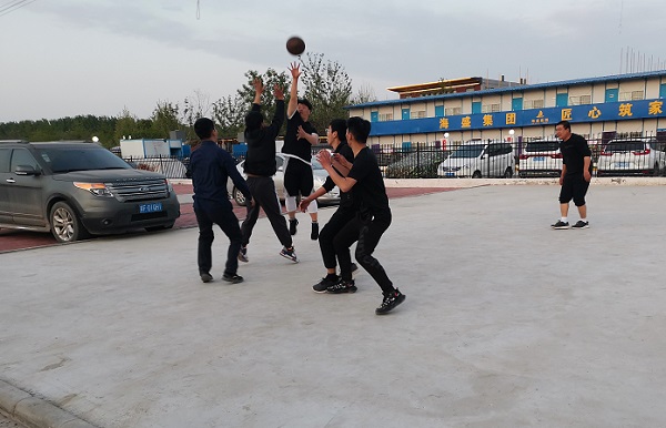 比较激烈的有禹州项目部的篮球比赛,项目经理李明洋特地邀请业主方、监理方为“甲队”,自有职工为“乙队”。比赛虽然没有“NBA”那么正规,但他们当中有的曾经是“校队主力”,有的曾经是“部队主力”,绝对亮出了“看家本领”。随着裁判一声“计时开始”,甲队率先发球,乙队苏腾超、秦泽豪拼抢、断球、紧接着运球、传球……双方运动员个个生龙活虎,展开了激烈的争夺,气氛立刻紧张起来。场外观众边喊“加油”,边紧紧盯住篮球传来传去,“啊,好球!”李佳豪三步上篮,腾空投进了一个球。监理王朋飞接到球后,一个大转身,左冲右突,也投进了一个球。比分交替上升,在2*20分钟的比赛中,双方队员没有发生侵入犯规,双方比的是技术,赛的是友谊。